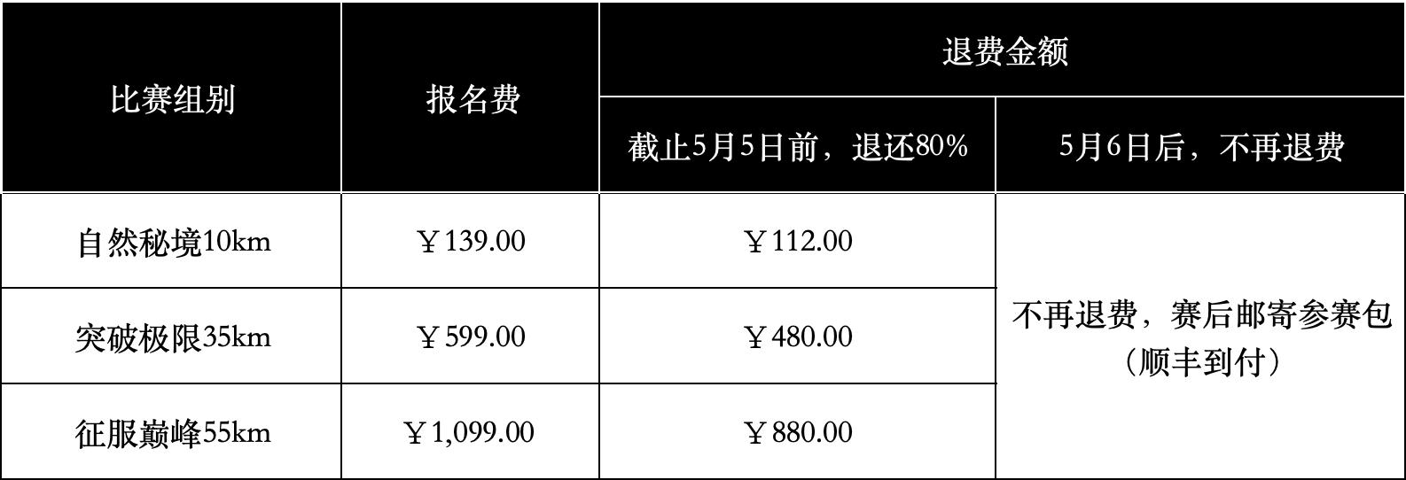 因不可抗力(含自然灾害、政府行政指令、公共安全事件等)导致赛事取消时:若在运动员报到前取消,组委会将在扣除不可撤销的运营成本后执行差额退费;若在赛事进行阶段取消或中止,报名费将不予退还,且不承担参赛者衍生经济损失(含差旅住宿等关联费用。)