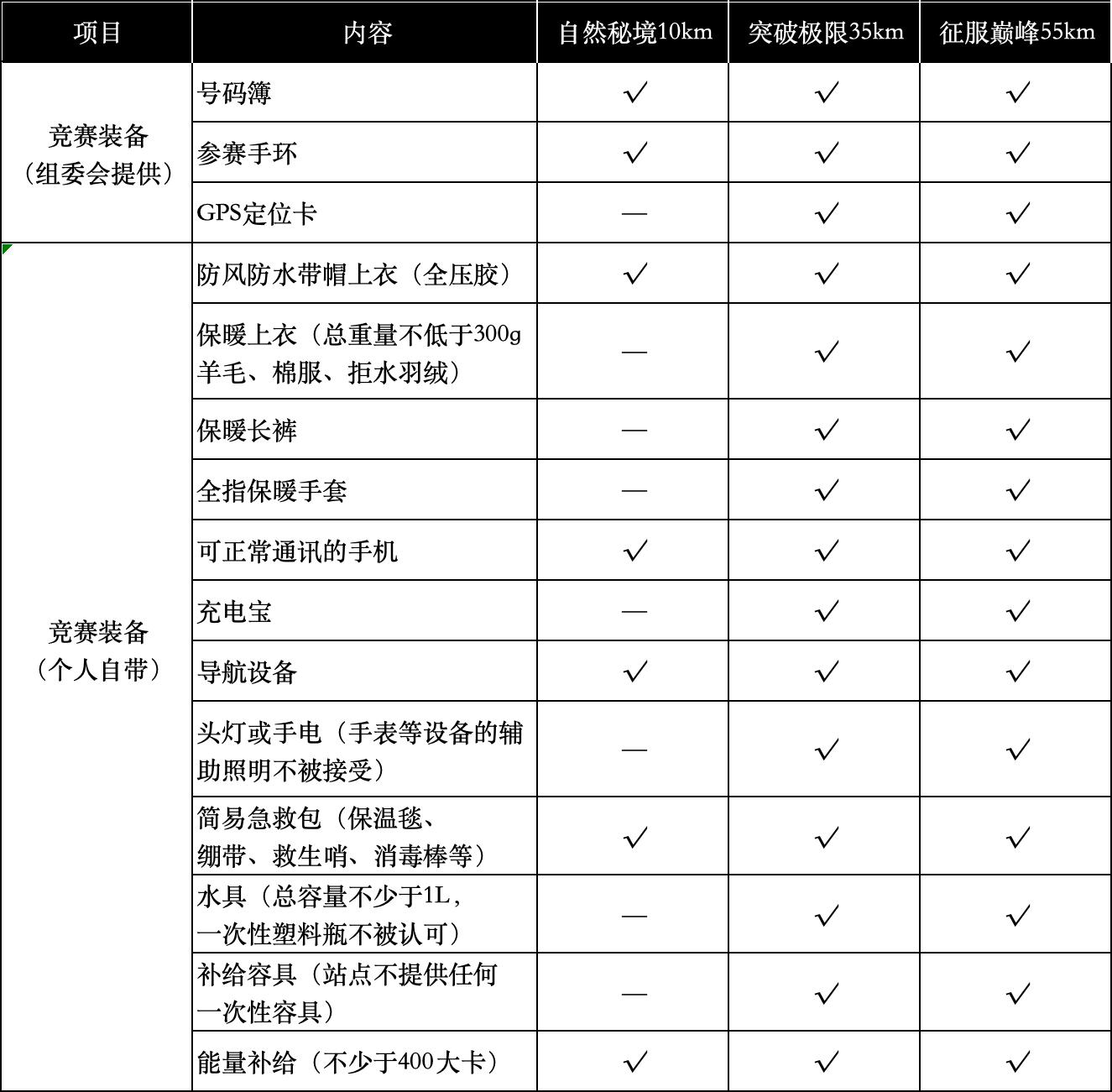 强制装备是保障运动员安全完赛的基本要求,组委会会在比赛规程中明确参赛运动员必须在比赛过程中全程携带强制装备: