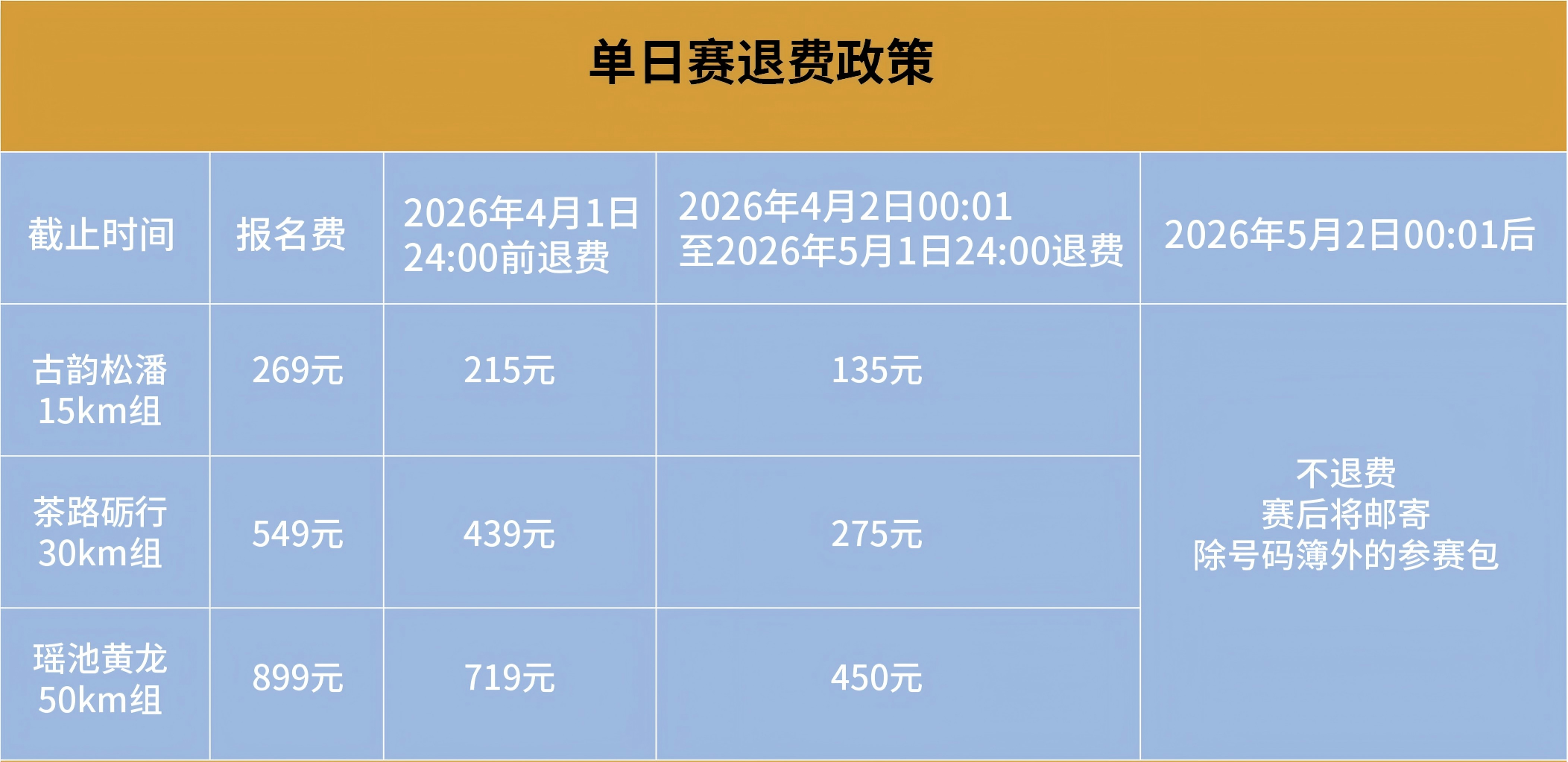 5、退款处理时间:赛事报名期间提交的退款申请将在7个工作日内完成审核。非报名期提交的退款申请将于每周周一集中审核处理。如遇特殊情况需紧急处理,请添加官方客服微信:SunflowerSharon(备注:2026黄龙极限耐力赛退费咨询),通过验证后我们将安排专人跟进处理。