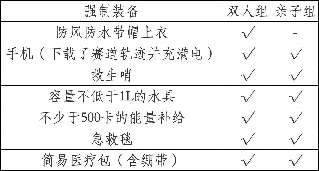 2.强制装备:在报到时需检查强制装备,强制装备未携带齐全,将不予发放参赛包。起跑检录将再次检查强制装备,缺少任何一项将取消比赛资格。比赛中工作人员也将会在各检查站抽查参赛包,强制装备不完整的选手将被取消成绩和终止比赛。