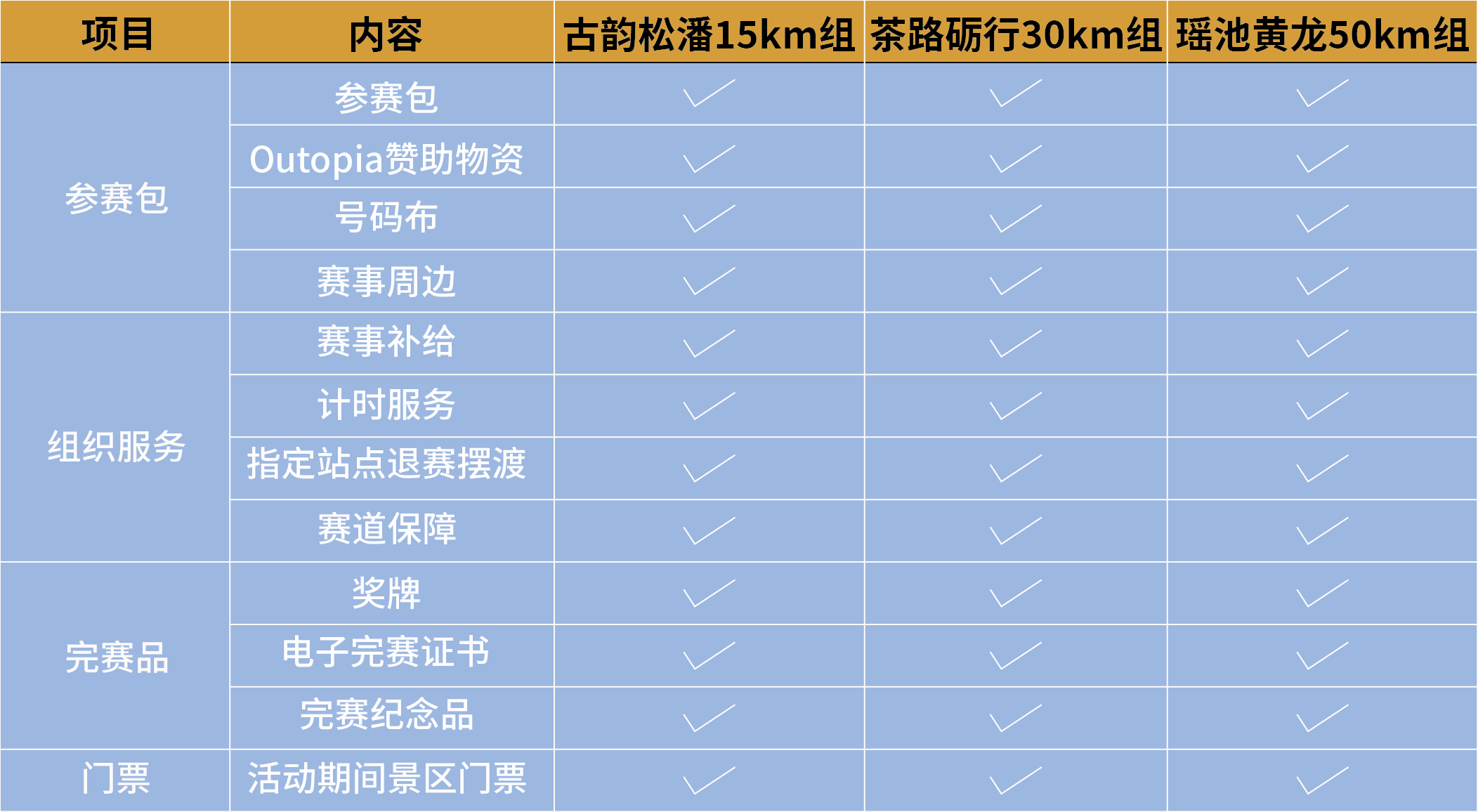 赛道按山地越野赛标准设置能量补给站,相邻补给站最大间距不超过10公里。每站均配有基础补给如水、干果、水果、粥,以及其他热食热饮等特色补给。赛前技术说明会会公布具体品种和明细。