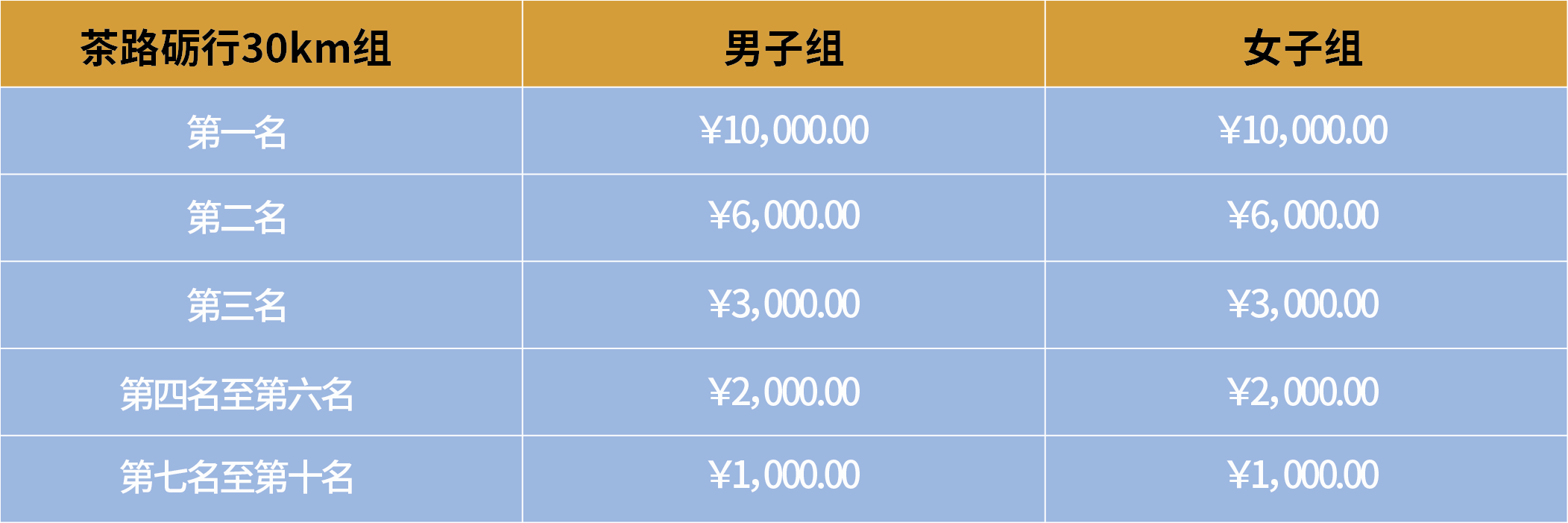 3. 奖金奖励:为了增加赛事的竞技性,茶路砺行30km组男女前十名将设现金奖励(税前)。